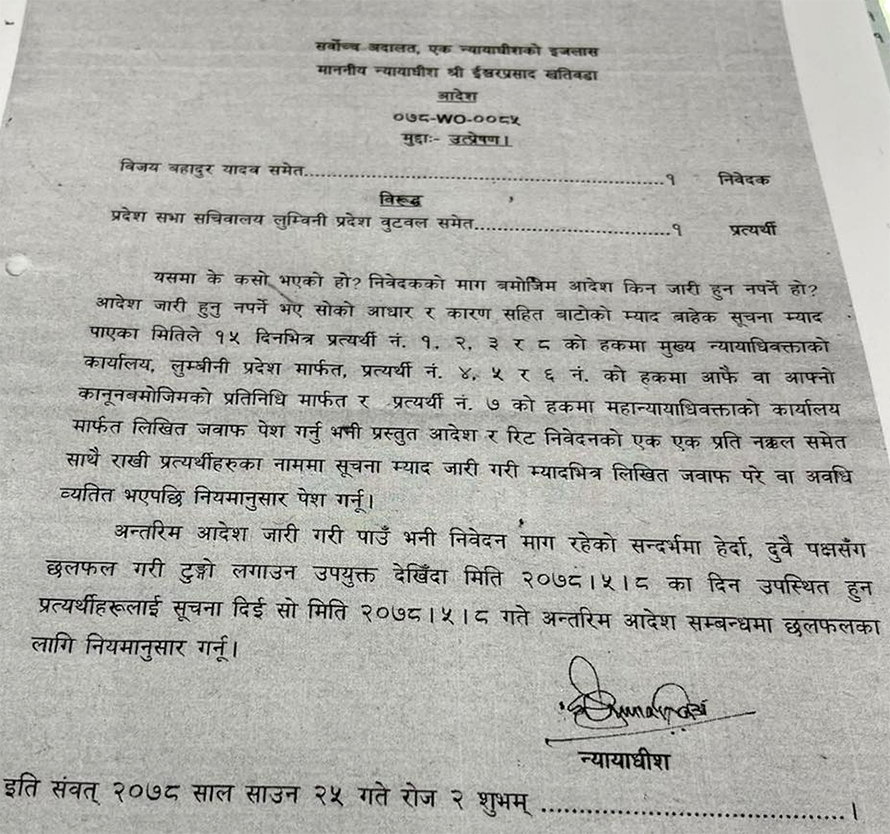 सर्वोच्चले विपक्षीसँग लिखित जवाफ माग गरेको छ भने अन्तरिम आदेशका लागि छलफल गर्न भदौ ८ गते दुवै पक्षलाई बोलाएको सर्वोच्चका प्रवक्ता बाबुराम दाहालले जानकारी दिए ।