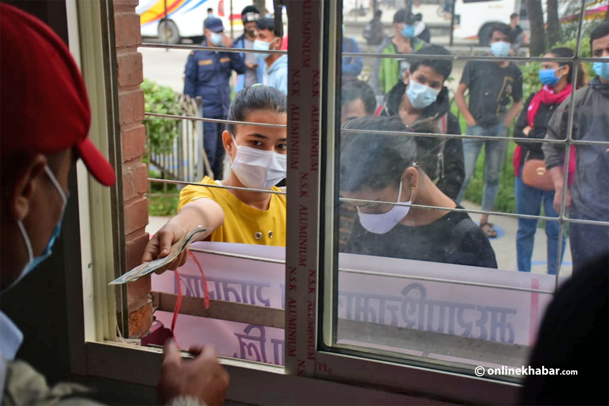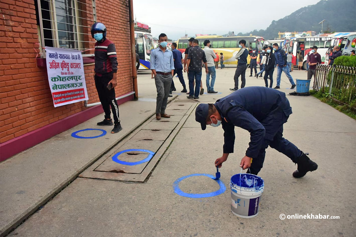 दशैंमा घर जान इच्छुक व्यक्तिहरु बिहानैदेखि टिकट लिन गोंगबुस्थित नयाँ बसपार्क पुगेका छन् । उनीहरुलाई दुरी कायम गरी लाइनमा राखेर अग्रिम टिकट बिक्री गरिएको देखिएको छ ।