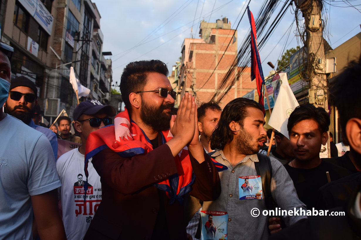 भिडको बीचतिर थिए, आफ्नै शैलीको दाह्री र चश्मामा सजिएका काठमाडौं महानगरपालिकाका मेयरका स्वतन्त्र उम्मेदवार बालेन्द्र साह (बालेन) ।
