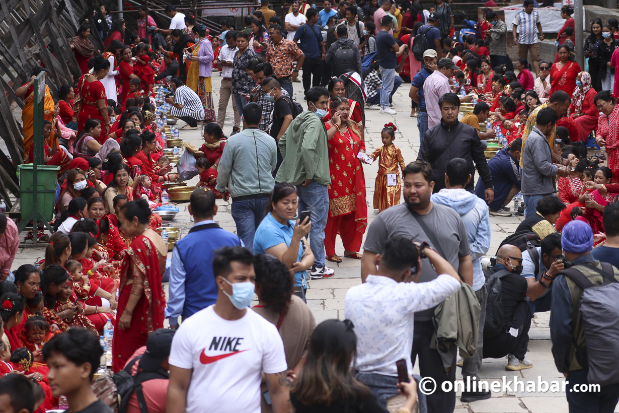बिहीबार सामूहिक पूजामा सहभागी हुन कुमारीहरु परम्परागत पोशाकमा सजिएर आएका थिए । धेरै कुमारीलाई अभिभावकले लिएर आएका थिए ।