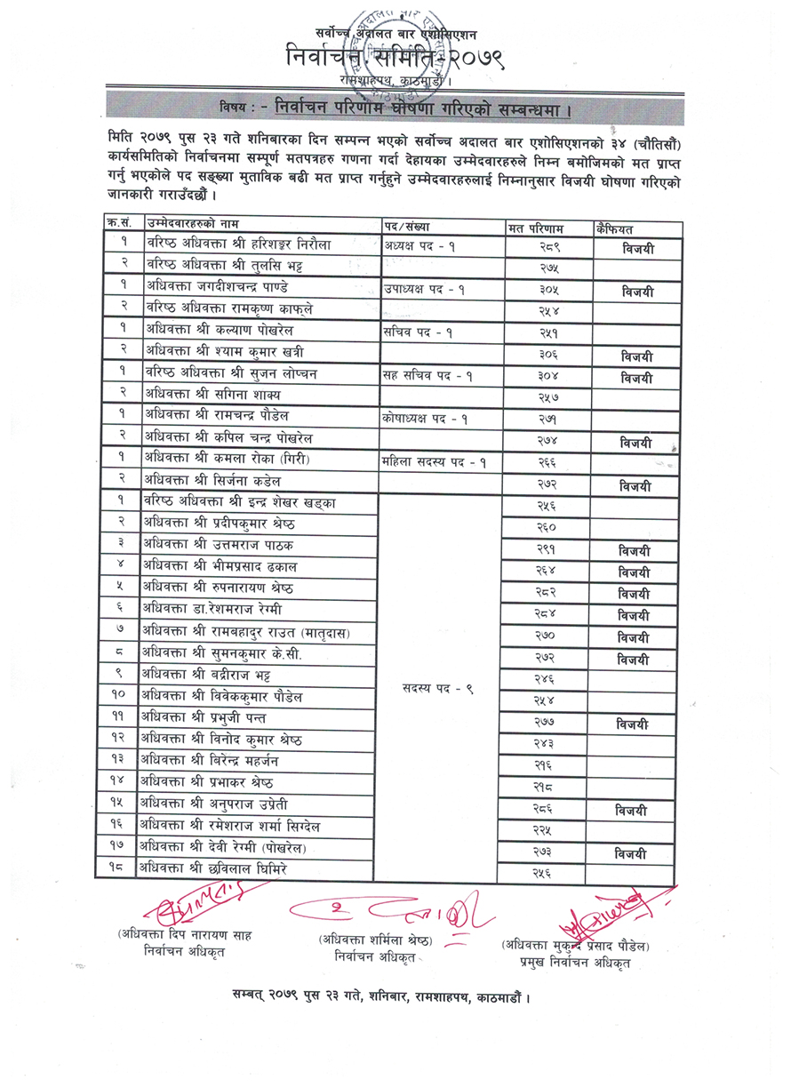 उपाध्यक्षमा लोकतान्त्रिक समूहका अधिवक्ता जगदिशचन्द्र पाण्डे, सचिवमा प्रगतिशील समूहका श्यामकुमार खत्री, सहसचिवमा लोकतान्त्रिक समूहका सुजन लोप्चन, कोषाध्यक्षमा प्रगतिशील समूहका कपिलचन्द्र पोखरेल निर्वाचित भएका निर्वाचन समितिले जनाएको छ ।
