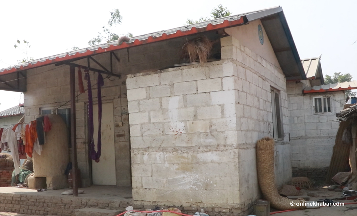 ‘गाई, बकरी, भैंस राख्नलाई’, सेनाले बनाएको घर अगाडि बनाइदिएको टहरा देखाउँदै स्थानीय ध्रुव मुखियाले भने ।