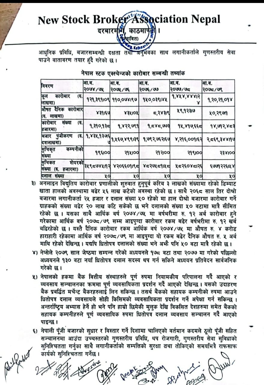 नियामक निकायबाट भएको सकारात्मक विकासलाई समेत नकारात्मक ढंगबाट व्याख्या गर्दै आफ्नो सिन्डिकेट एवं एकाधिकार कायम हुनुपर्छ भन्ने संकुचित मानसिकताका साथ पूँजी बजारमा संलग्न धितोपत्र दलाल व्यवसायीहरुको संगठन स्टक ब्रोकर्स एसोसिएसन अफ नेपालले भ्रामक, कपोलकल्पित, आधारहीन विज्ञप्ति जारी गरेको नयाँ सेयर ब्रोकरहरुले बताएका छन् ।