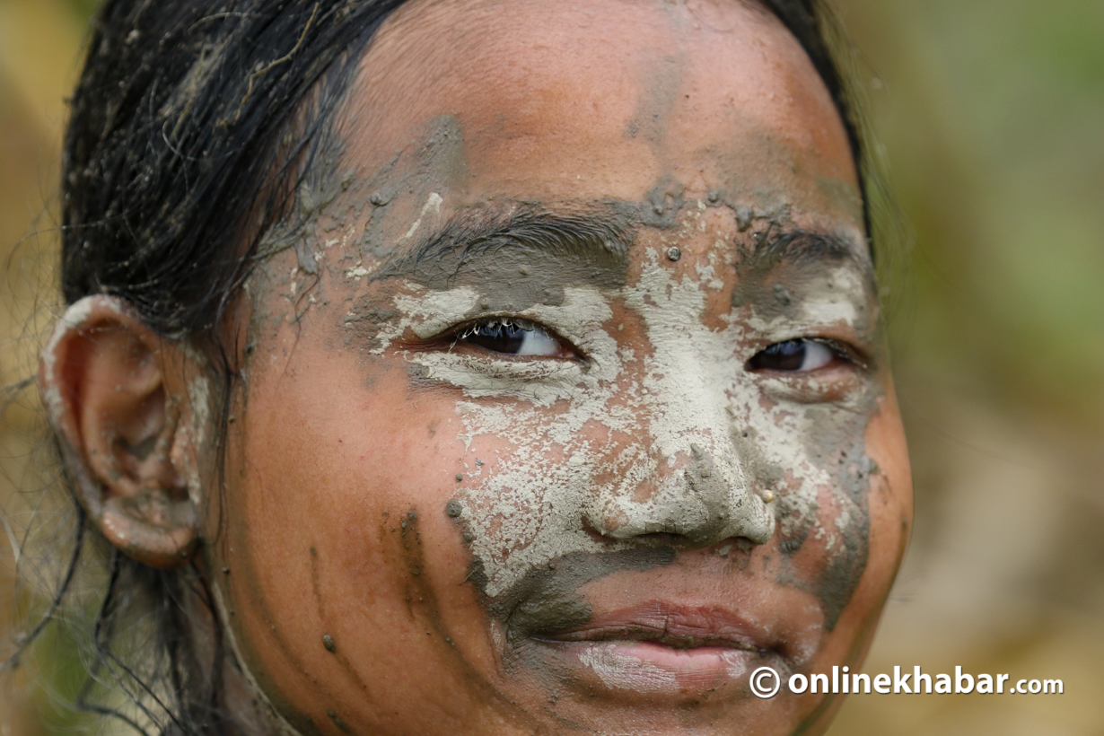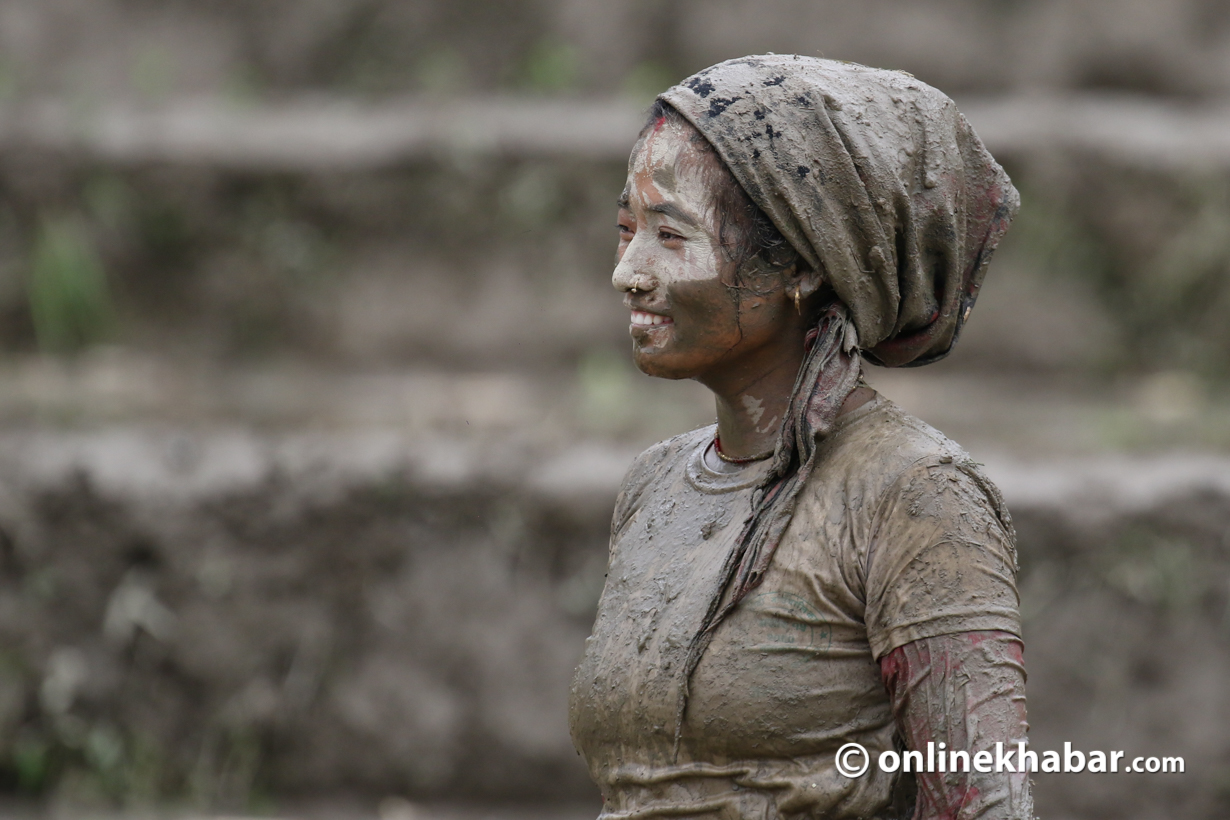 रोपाइँमा आएका रोपाहरु कोही नेवारी ड्रेसमा थिए भने कोही साधारण पोशाकमा। क्षणभरमै हिलोको रंगले उनीहरुको अनुहार पोतियो ।