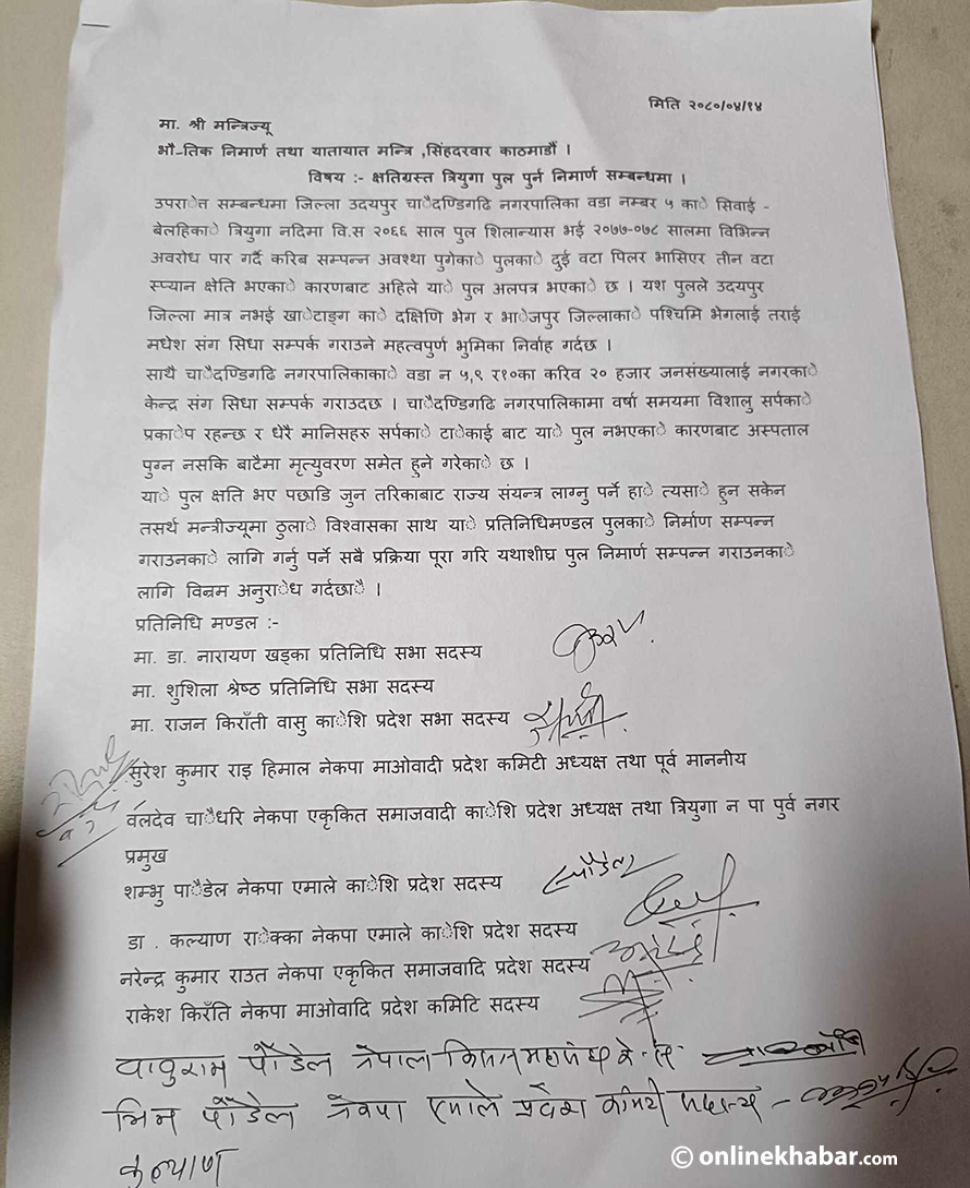 पुल नबन्दा सर्पदंश लगायतका बिरामीहरुलाई उपचारका लागि अस्पताल लैजानसमेत समस्या भएको भन्दै तत्काल भाँचिएको पुल निर्माण सम्पन्न गरिदिन प्रतिनिधि सभा सदस्य डा. नारायण खड्का, प्रदेश सभा सदस्य राजन किराँतीसहितको टोलीले आइतबार भौतिक मन्त्रालयमा भेटेर मन्त्रीसँग माग गरेको हो ।