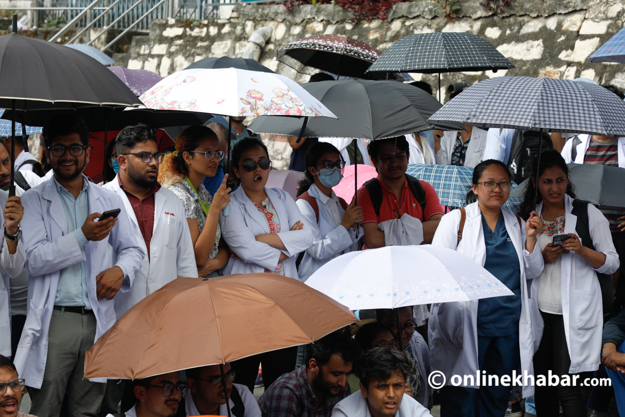 डाक्टरहरू माइतीघरबाट नयाँबानेश्वर चोकसम्म अएर सडकमै बसेर प्रदर्शन जारी राखेका छन् । उनीहरूले डाक्टरमाथिको कुटपिट बन्द गर, ‘प्रजनन् सम्बन्धी डाक्टरको जीवनको रक्षा गर’का नारा उनीहरूले सडकमै लगाएका छन् ।