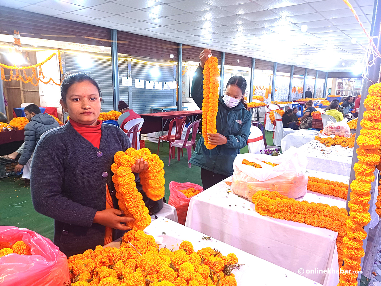 तिहारका लागि पोखरा महानगरपालिकाले सयपत्री मेला आयोजना गरेर सिद्धार्थ चोकको श्रीकम्प्लेक्समा फूलमाला बेच्ने ठाउँ तोकिदिएको छ । अघिल्लो वर्षसम्म पोखराका मुख्य चोक र सडकमा फूल बिक्री गर्ने किसानलाई महानगरले कम्प्लेक्समा स्टल दिएको छ । तर, ग्राहक नआएपछि किसानहरु आफैंले बुनेको माला हेर्छन्, उठाउँछन्, राख्छन् र चुकचुकाउँछन्, ‘बरु सडकको पेटी नै ठीक थियो ।’
