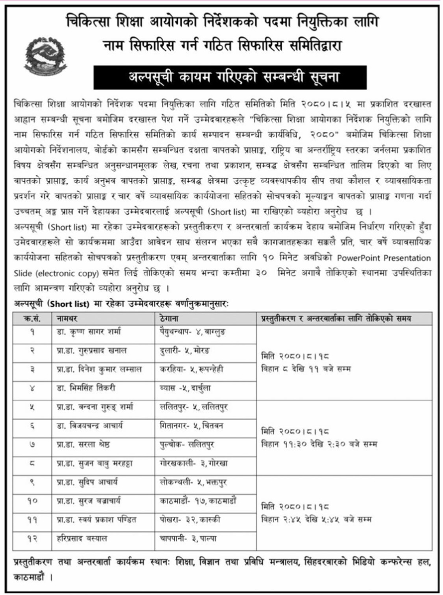 १७ मंसिर, काठमाडौं । चिकित्सा शिक्षा आयोगको रिक्त चार निर्देश पदमा आवेदन दिएकामध्ये १२ जनाको नाम प्रारम्भिक छनोट (सर्ट लिस्ट) मा परेको छ ।