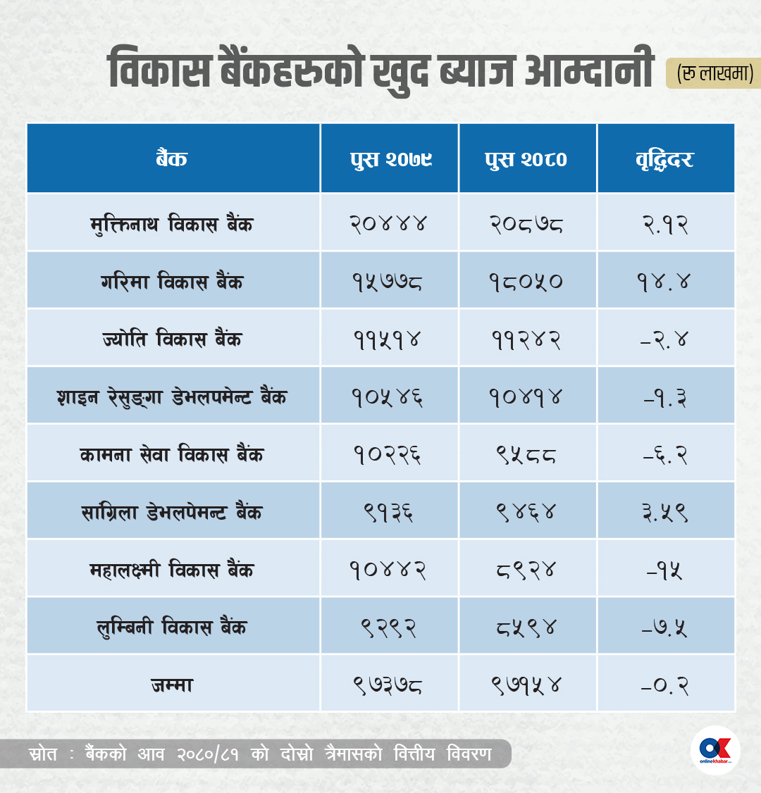 चालु आव दोस्रो त्रैमासमा पाँच विकास बैंकको खुद ब्याज आम्दानी घटेको छ । मुक्तिनाथ र सांग्रिला डेभलमेन्टको खुद ब्याज आम्दानी सामान्य बढ्दा गरिमाको भने १४.४ प्रतिशत बढेको हो । अन्य आठको भने घटेको छ ।