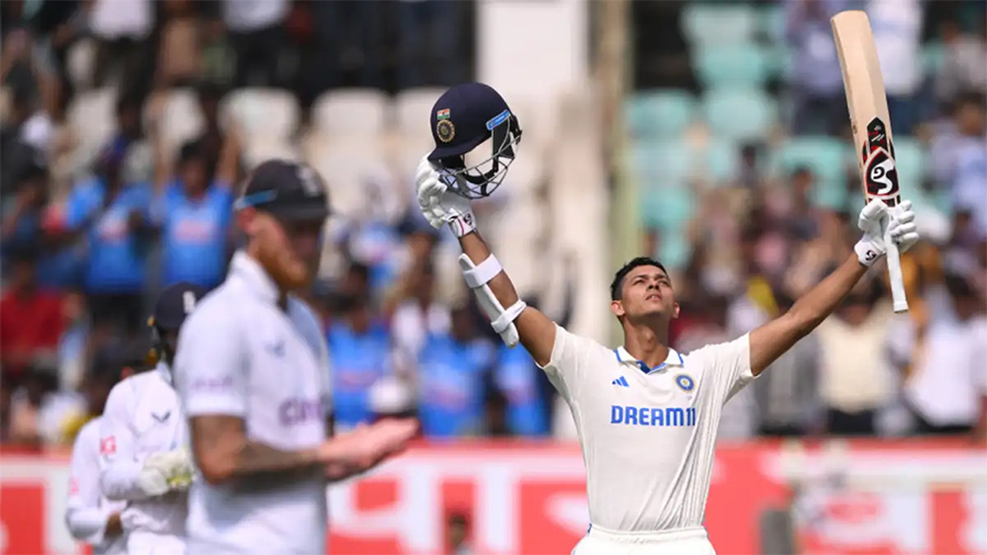 जैसवालले स्पिनर शोएब बसिरलाई छक्का र चौका हान्दै २७७ बलमा आफ्नो अन्तर्राष्ट्रिय क्रिकेट करिअरको पहिलो शतक पूरा गरेका हुन् ।