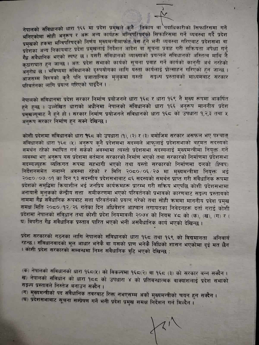 हेर्नुहोस् मुख्यमन्त्रीले प्रदेश प्रमुखलाई बुझाएको पत्र