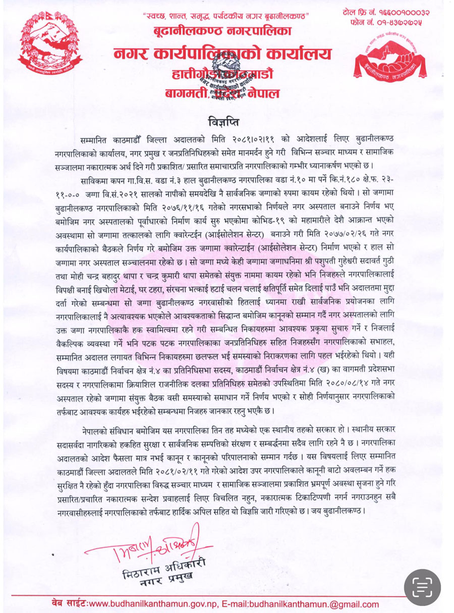 आदेश पालना नगरेर अदालतको अवहेलना गरेको ठहर गर्दै जिल्ला अदालत, काठमाडौंका न्यायाधीश डा. राजेन्द्रकुमार आचार्यको इजलासले ११ जेठमा बूढानीलकण्ठ नगरका मेयर मिठाराम अधिकारीसँगै वडा नम्बर १० का वडाध्यक्ष नवराज भट्टराई, वडा नम्बर ८ का सुमन तामाङ र वडा नम्बर १० का वडा सदस्य चन्द्रमान श्रेष्ठलाई एक–एक महिना कैदको आदेश सुनाएको छ ।