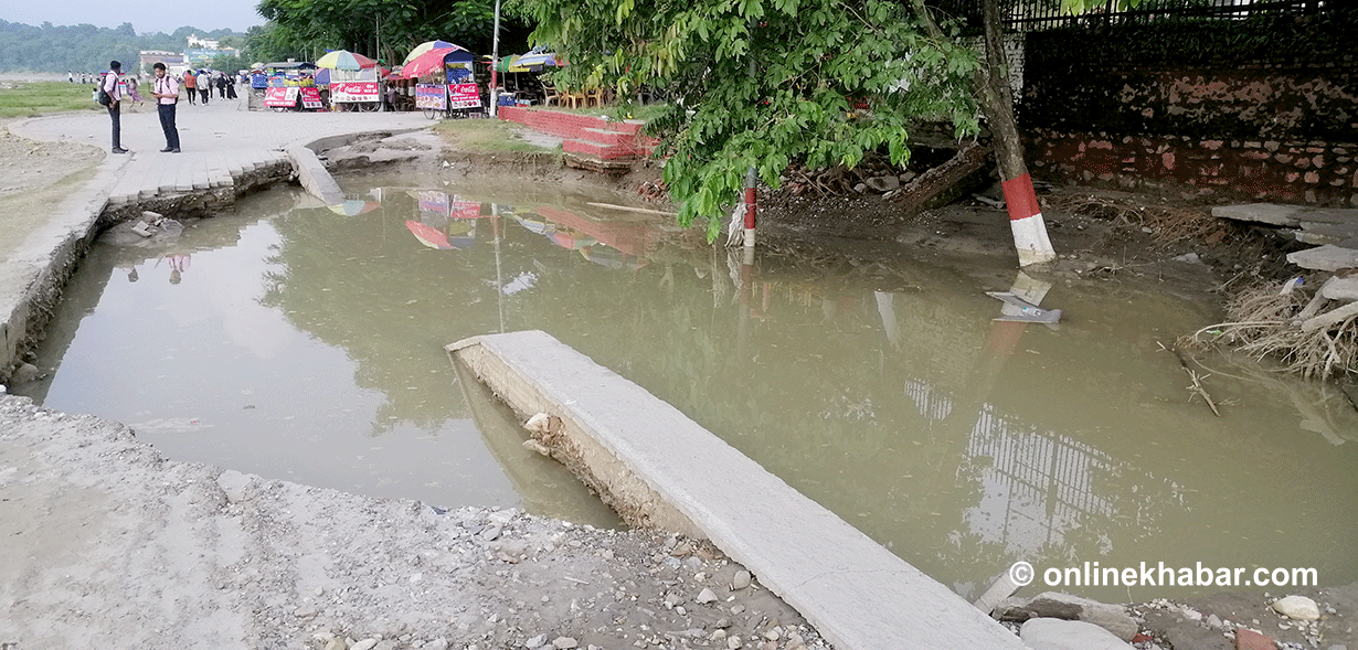 तर गत शनिबार आएको बाढीले नारायणी नदी किनारको त्यो सुन्दरतालाई बिगारेको छ । बाढीले झण्डै ८ सय मिटर जति लामो चौरलाई ठाउँ–ठाउँमा खोतलेर बगरमा परिणत गरिदिएको छ । नदी किनारमा ६४० मिटर लम्बाइको खुट्किलासहितको ‘आरसीसी स्ट्रक्चर’ लाई भने बाढीले क्षति गरेको छैन ।