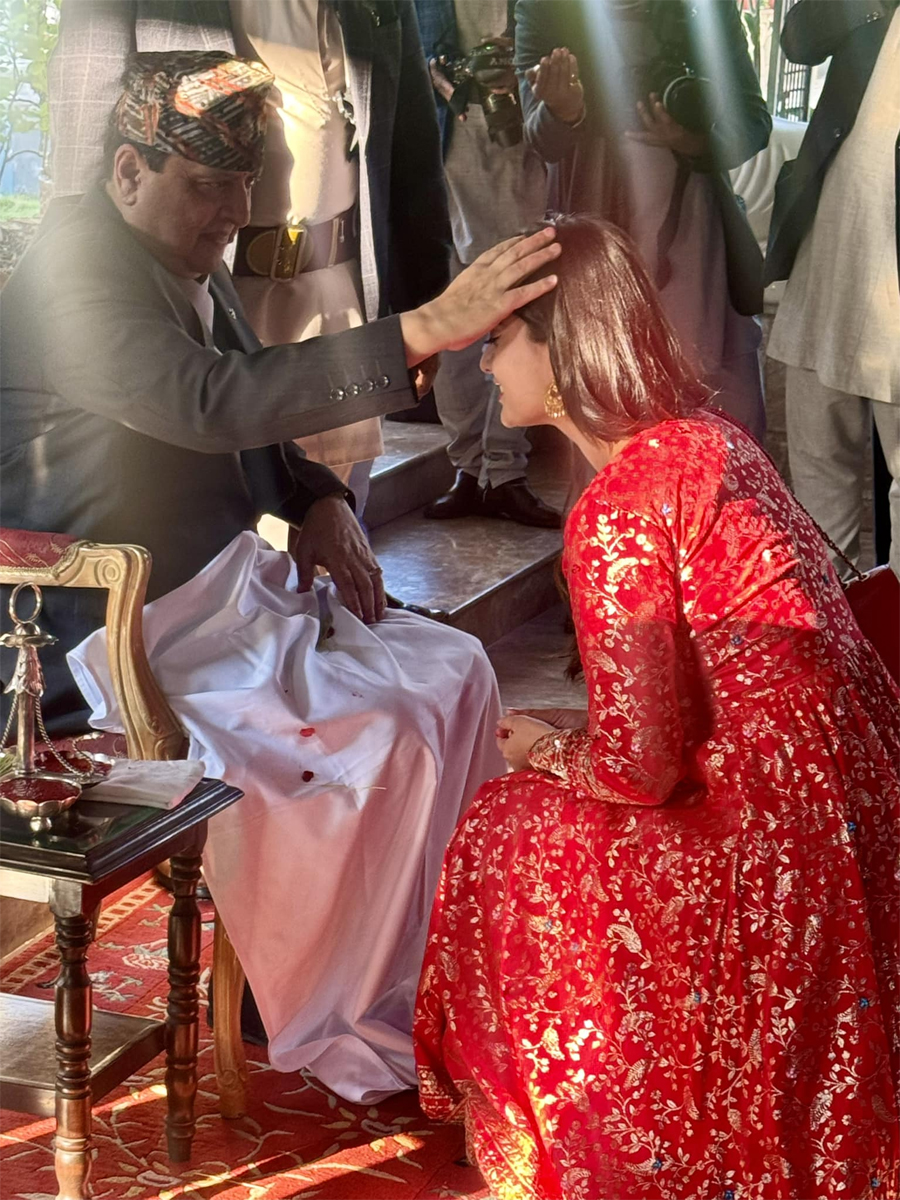 अभिनेत्री मनिषा कोइराला पूर्वराजाबाट टीका लगाउँदै । तस्वीर : आर्यन धिमाल