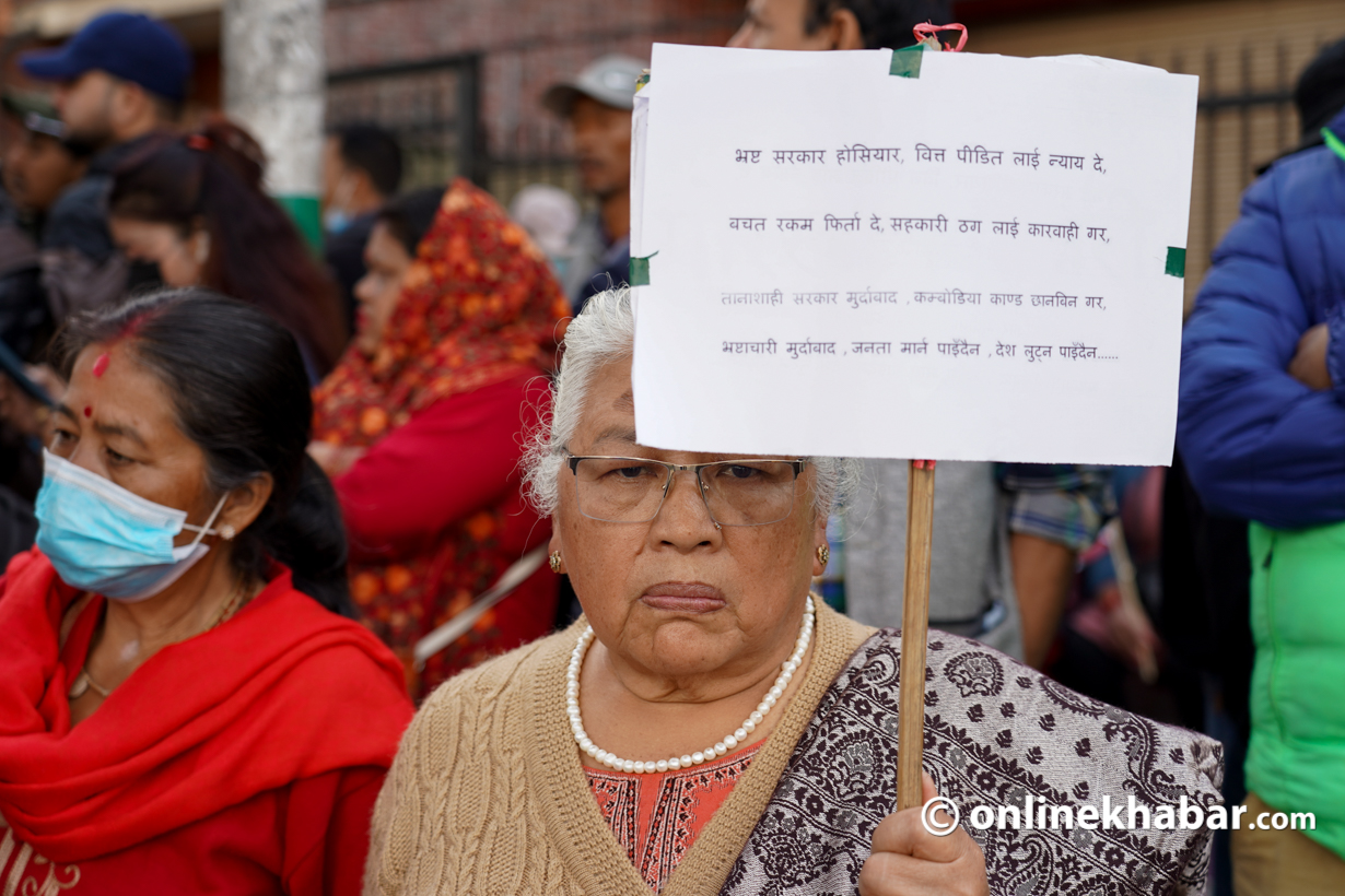 उनीहरूले सरकारप्रति आक्रोश पोखेका छन् । उनीहरूले भ्रष्ट सरकार होसिया, वित्त पीडितलाई न्याय दे, बचत रकम फिर्ता दे, सहकारी ठगलाई कारबाही गर, तानाशाही सरकार मुर्दावाद, कम्बोडिया काण्ड छानबिन गर, भ्रष्टाचारी मुर्दावाद, जनता मार्न पाइदैन, देश लुट्न पाइदैन’ लगायतका नारा लेखेर प्रदर्शन गरिरहेका छन् ।