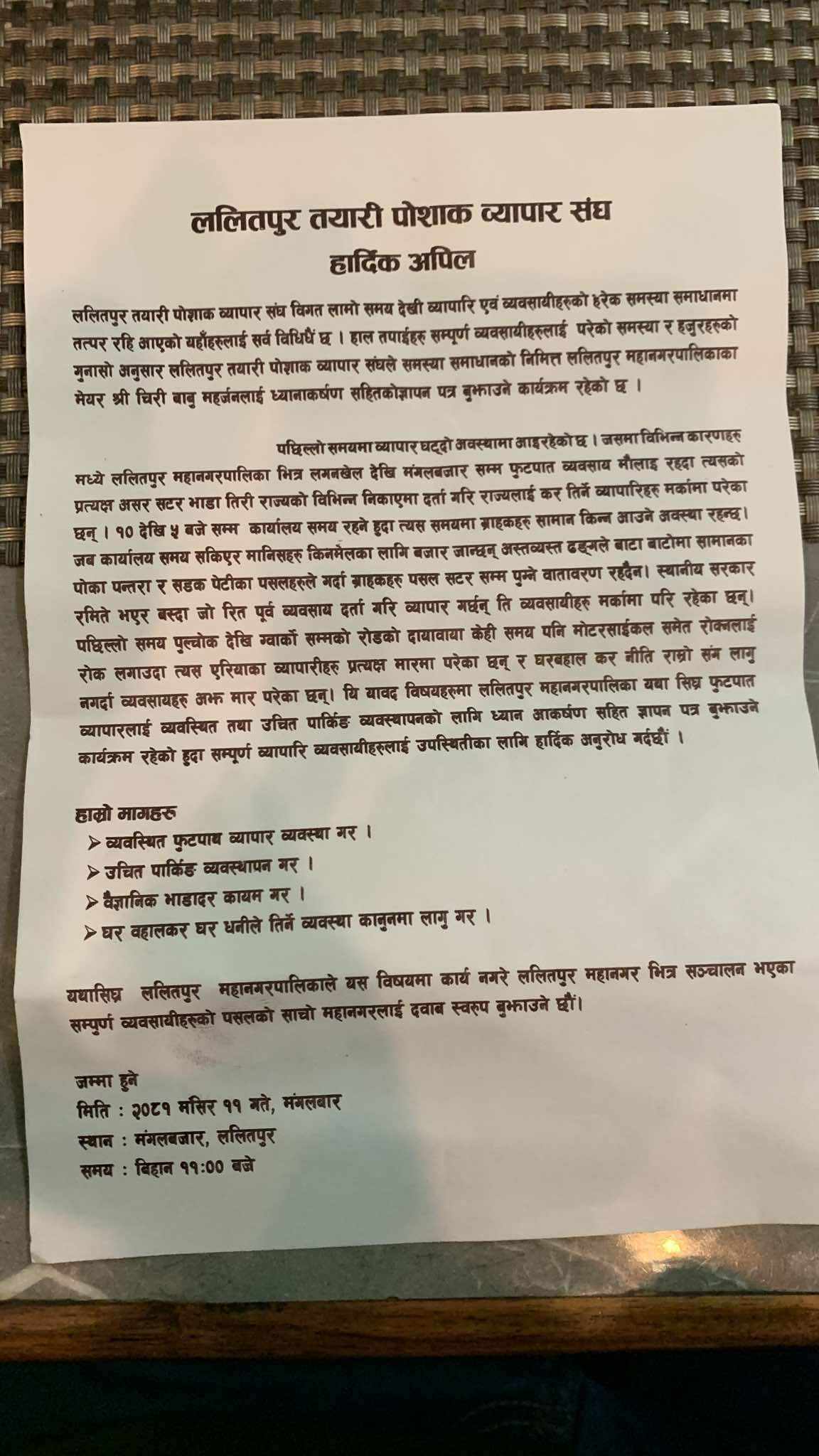 महानगरपालिका प्रमुख चिरीबाबु महर्जनलाई ध्यनाकर्षणसहित ज्ञापन पत्र बुझाउने कार्यक्रम पनि तय भएको संघले जानकारी गराएको छ ।