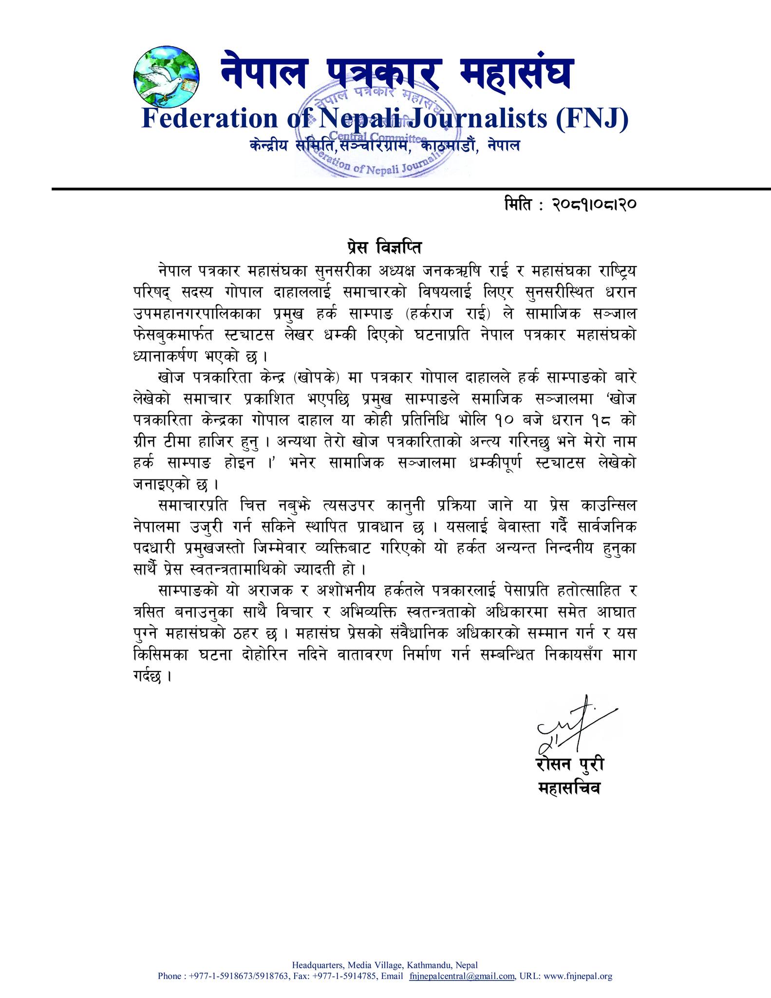 त्यसप्रति आपत्ति जनाउँदै महासंघका महासचिव रोसन पुरीले जारी गरेको विज्ञप्तिमा भनिएको छ– ‘नेपाल पत्रकार महासंघ, सुनसरीका अध्यक्ष जनकऋषि राई र महासंघका राष्ट्रिय परिषद् सदस्य गोपाल दाहाललाई समाचारको विषयलाई लिएर सुनसरीस्थित धरान उपमहानगरपालिकाका प्रमुख हर्क साम्पाङ (हर्कराज राई) ले सामाजिक सञ्जाल फेसबुक मार्फत स्टाटस लेखेर धम्की दिएको घटनाप्रति नेपाल पत्रकार महासंघको ध्यानाकर्षण भएको छ ।’