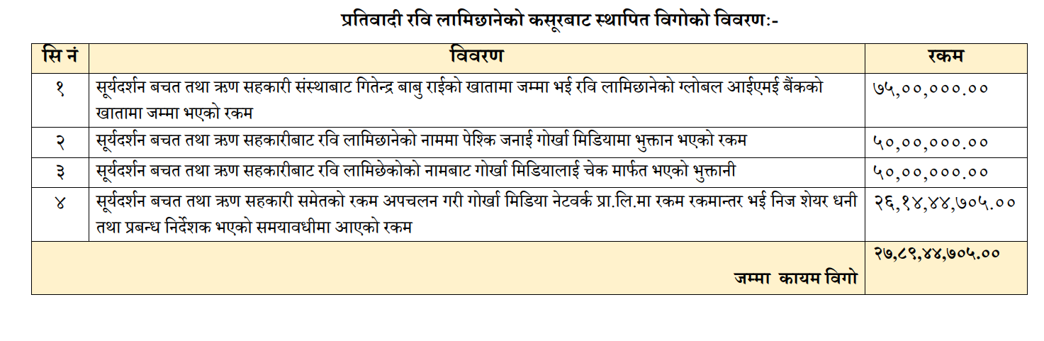 रवि लामिछाने गोर्खा मिडियाको प्रबन्ध निर्देशक भएका बेलामा सहकारीबाट ६७ करोड ८७ लाख रुपैयाँ आएको अनि त्यो रकम उनीहरूको खातामा समेत पुगेको आरोपपत्रमा उल्लेख छ । जस अनुसार, रविको खातामा करिब २९ करोड रुपैयाँ आएको आरोपपत्रमा उल्लेख छ ।