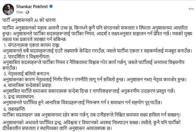 पार्टी निर्णयको बचाऊ गर्दै महासचिव पोखरेलले पार्टी अनुशासन बारे एआईको धारणा भन्दै एक सन्देश बुधबार साँझ शेयर गरेका छन् । ‘पार्टी अनुशासनबारे एआईको धारणा’ शिर्षकमा शेयर गरिएको सामग्रीमा पार्टी अनुशासनको महत्व बारे उल्लेख गरिएको छ ।
