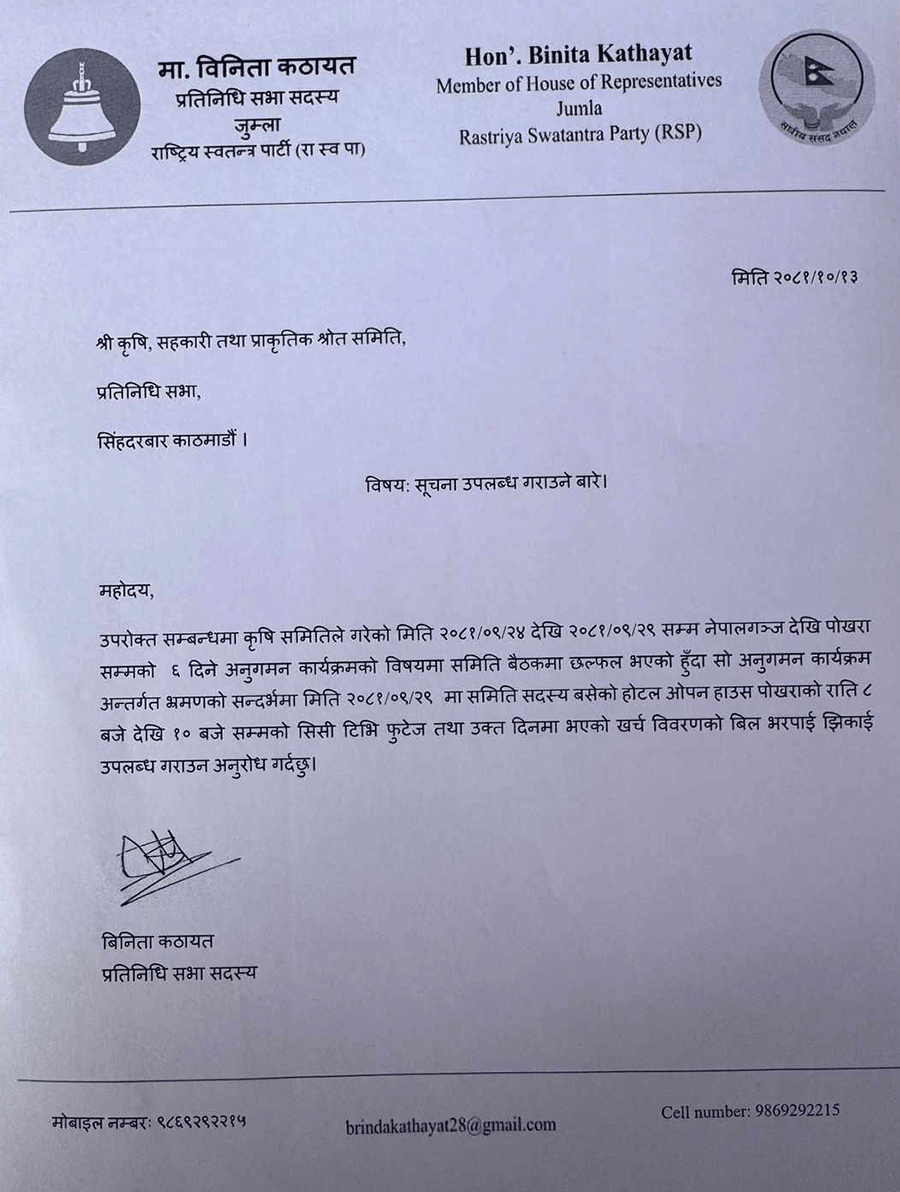 प्रतिनिधिसभा अन्तर्गत कृषि, सहकारी तथा प्राकृतिक स्रोत समितिमा सांसद कठायतले पोखरास्थित होटल ओपन हाउसबाट राति ८ देखि १० बजेसम्मको सीसीटीभी फुटेज झिकाउन माग गरेकी हुन् ।