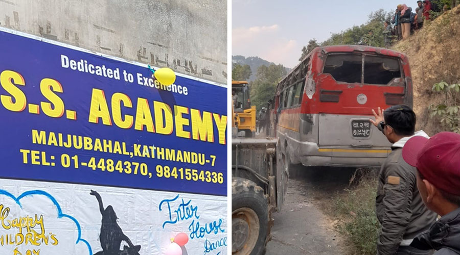 ३० माघ, काठमाडौं । काठमाडौंको शंखरापुर नगरपालिका–५ मा चाबहिलको मैजुबहालस्थित सत्य साई एकेडेमीले आफ्ना विद्यार्थीलाई वनभोज लगेको थियो । कात्तिकेमा रमाइलो गरेर फर्किएका विद्यार्थी सवार बस बीचबाटोमै दुर्घटनामा पर्यो ।