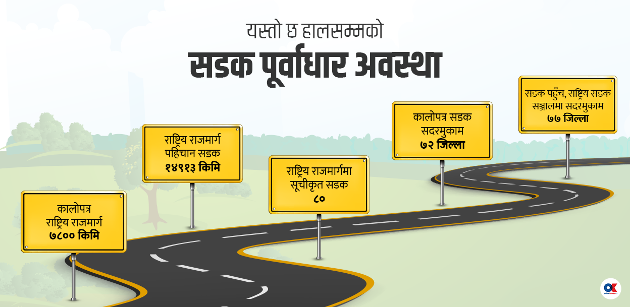 राणा कालमै ३७६ किलोमिटर सडक निर्माण भएको इतिहास छ । त्यसयता सडकको लम्बाईले १ लाख २ हजार किलोमिटर पार गरे पनि गत असारसम्म कालोपत्रे सडकको लम्बाई ७ हजार ८ सय किलोमिटर मात्रै छ । चार लेन वा सो भन्दा बढी लेनको कालोपत्रे सडक असारसम्म ४ सय किलोमिटर रहेको तथ्यांक छ ।