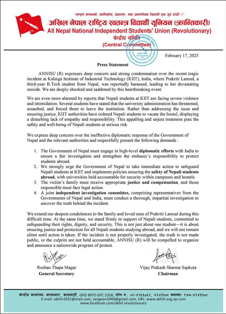 ५ फागुन, काठमाडौं । भारतको कलिङ्ग इन्स्टिच्युट अफ इन्डस्ट्रियल टेक्नोलोजी (केआईआईटी) मा बी.टेक. तेस्रो वर्षमा अध्ययनरत नेपाली छात्रा प्रकृति लम्सालमाथि भएको दुर्व्यवहार र उनको सम्भावित आत्महत्याको घटनाको अनेरास्ववियु (क्रान्तिकारी) ले निन्दा गरेको छ।
