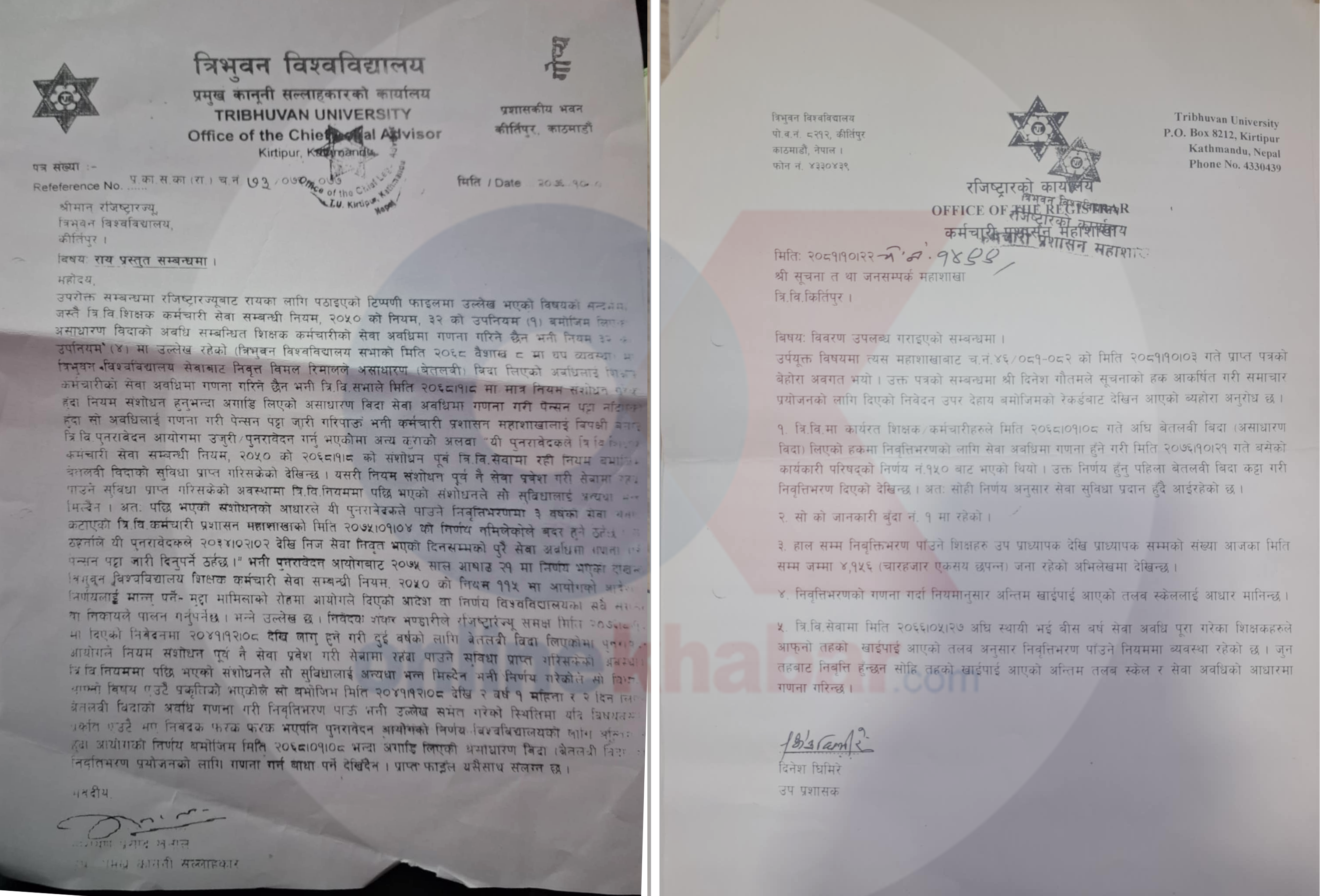 त्रिविका पूर्व रजिस्ट्रार पेशल दाहाल पुनरावेदन आयोगको निर्णय अन्तिम हुने बताउँछन् । ‘नियममा बेतलबी बिदालाई सेवा अवधिमा नजोड्ने भन्ने छ । २०६८ मा नियम संशोधन हुनुअघि जोड्ने वा नजोड्ने केही भनेको थिएन । पुनरावेदन आयोगको निर्णय अन्तिम हुने भनिएको छ’ उनले भने, ‘त्रिविभित्रकै एउटाले गरेको निर्णयको विरुद्ध अर्को अदालत जाने कुरा पनि भएन ।’