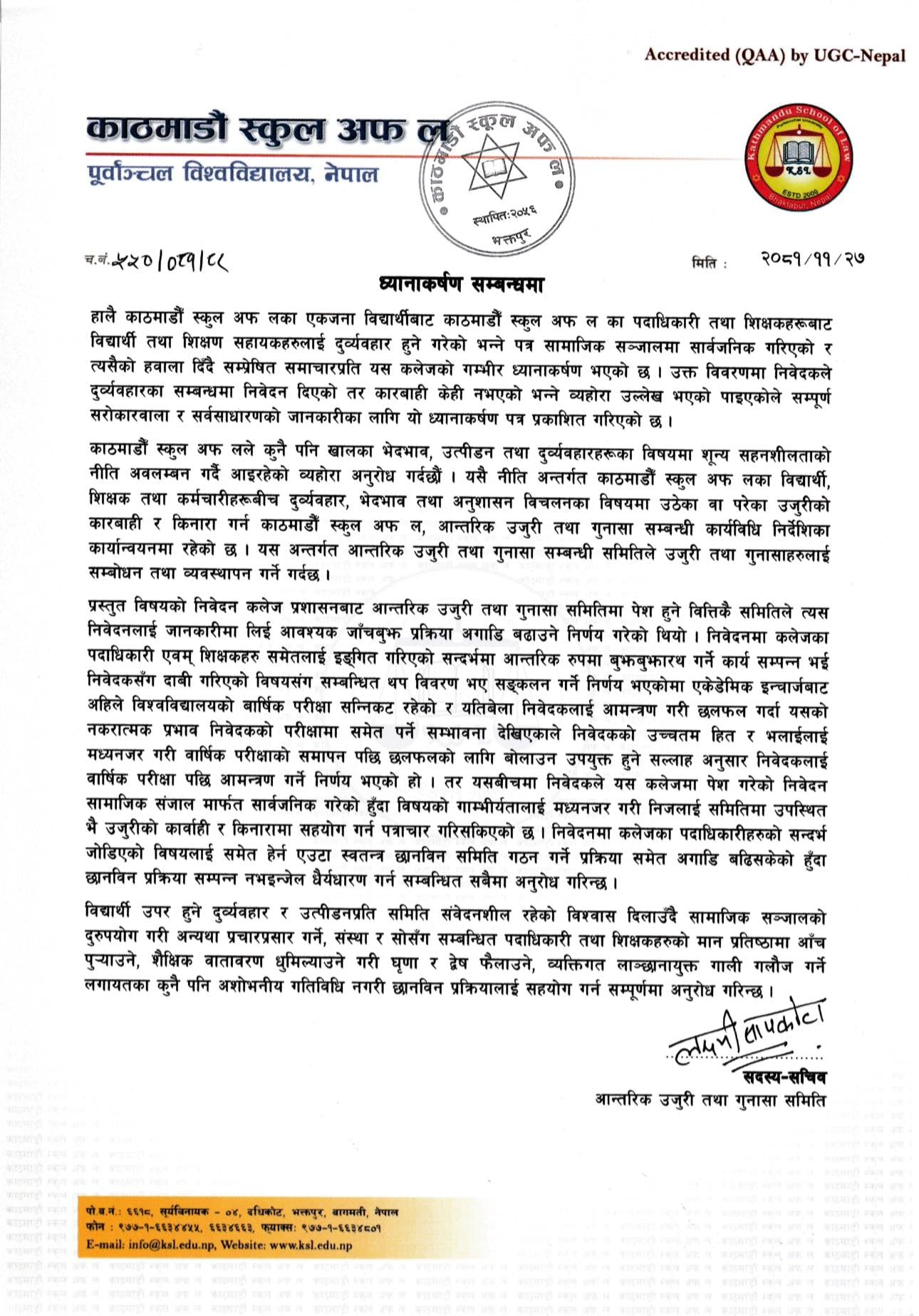 आन्तरिक उजुरी तथा गुनासो समितिकी सदस्यसचिव लक्ष्मी सापकोटाले हस्ताक्षर गरेको विज्ञप्तिमा कलेजमा पेस गरेको निवेदन सामाजिक सञ्जालमार्फत सार्वजनिक गरेको