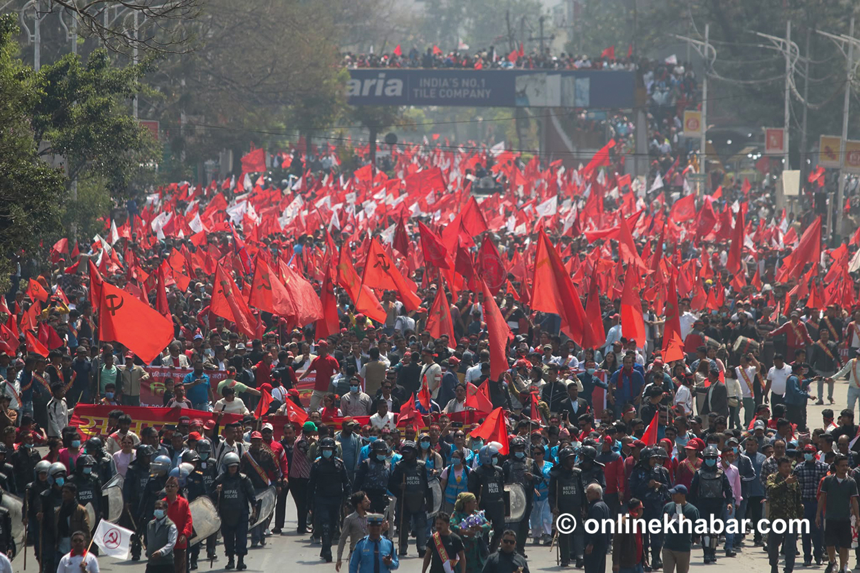 मोर्चामा रहेको नेपाल कम्युनिस्ट पार्टीका महासचिव नेत्रविक्रम चन्दलगायतका नेताहरूले जुलुसको नेत्रित्व गरेका छन् ।