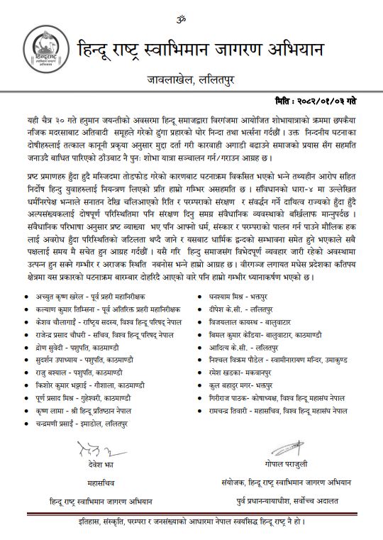 साथै, हिन्दु युवाहरूलाई प्रहरीले पक्राउ गरेकोप्रति अभियानले आपत्ति समेत जनाएको छ ।