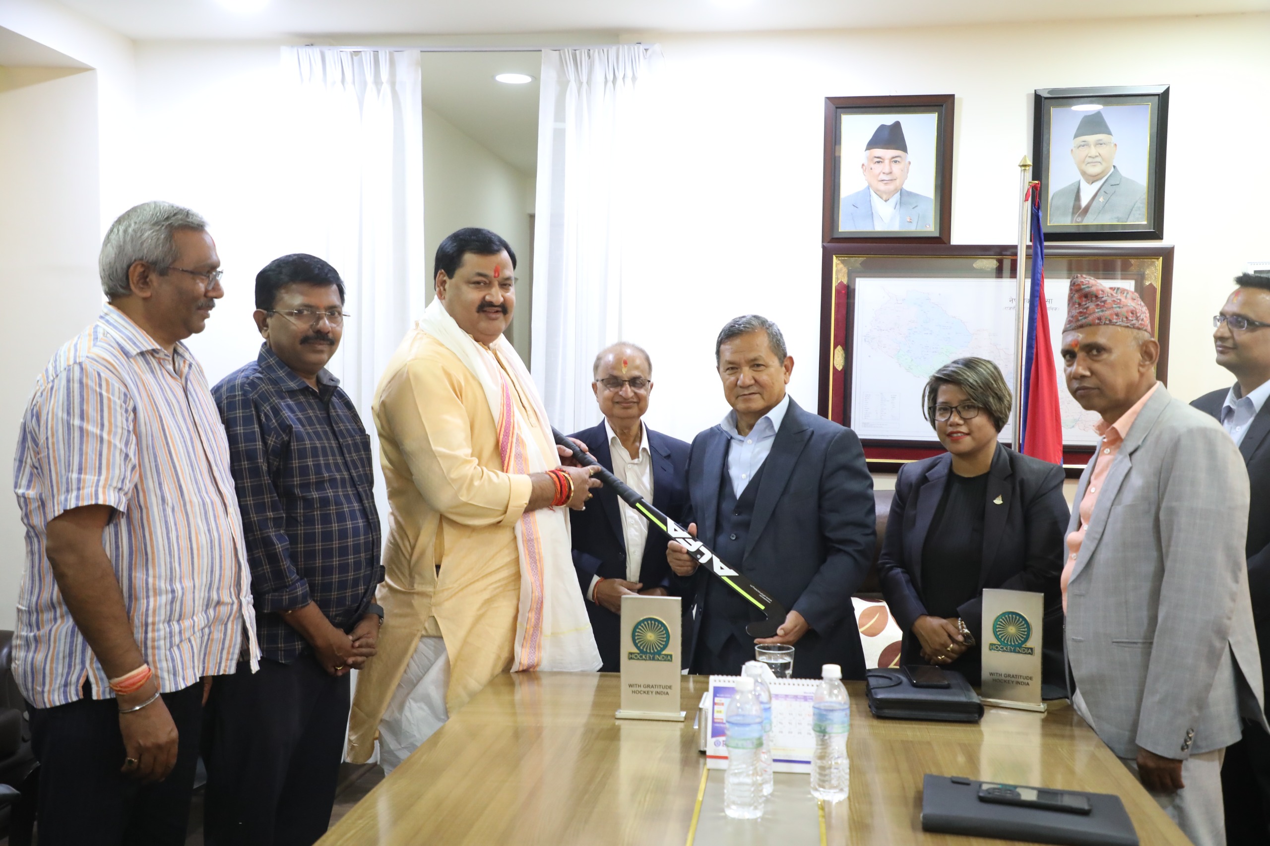 एसियाली हक्की महासंघका उपाध्यक्ष एवं भारतीय हक्की संघका महासचिव भोलानाथ सिंह, भारतीय हक्की संघका कोषाध्यक्ष सेकर मनोहरण र भारतीय हक्की संघका प्रबन्ध निर्देशक रविकान्त श्रीवास्तवसहित बिहीबार नेपाल आएको टोलीले सामग्री हस्तान्तरण गर्‍यो ।