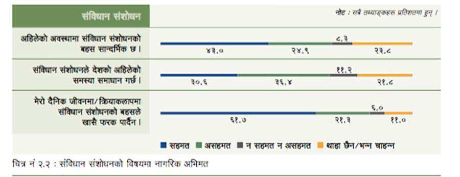 अहिलेको अवस्थामा संविधान संशोधनको बहस सान्दर्भिक छ भन्ने ४३ प्रतिशत छन् भने संविधान संशोधनले देशको अहिलेको समस्यालाई समाधान गर्छ भन्ने ३०.६ प्रतिशत मात्र छन् । आफ्नो दैनिक जीवनमा/क्रियाकलापमा संविधान संशोधनको बहसले खासै फरक पार्दैन भन्ने ६१.७ प्रतिशत छन् भने संविधान संशोधन भएमा अहिलेको असन्तुष्टि सम्बोधन हुन्छ भन्ने ४१.४ प्रतिशत छन् ।