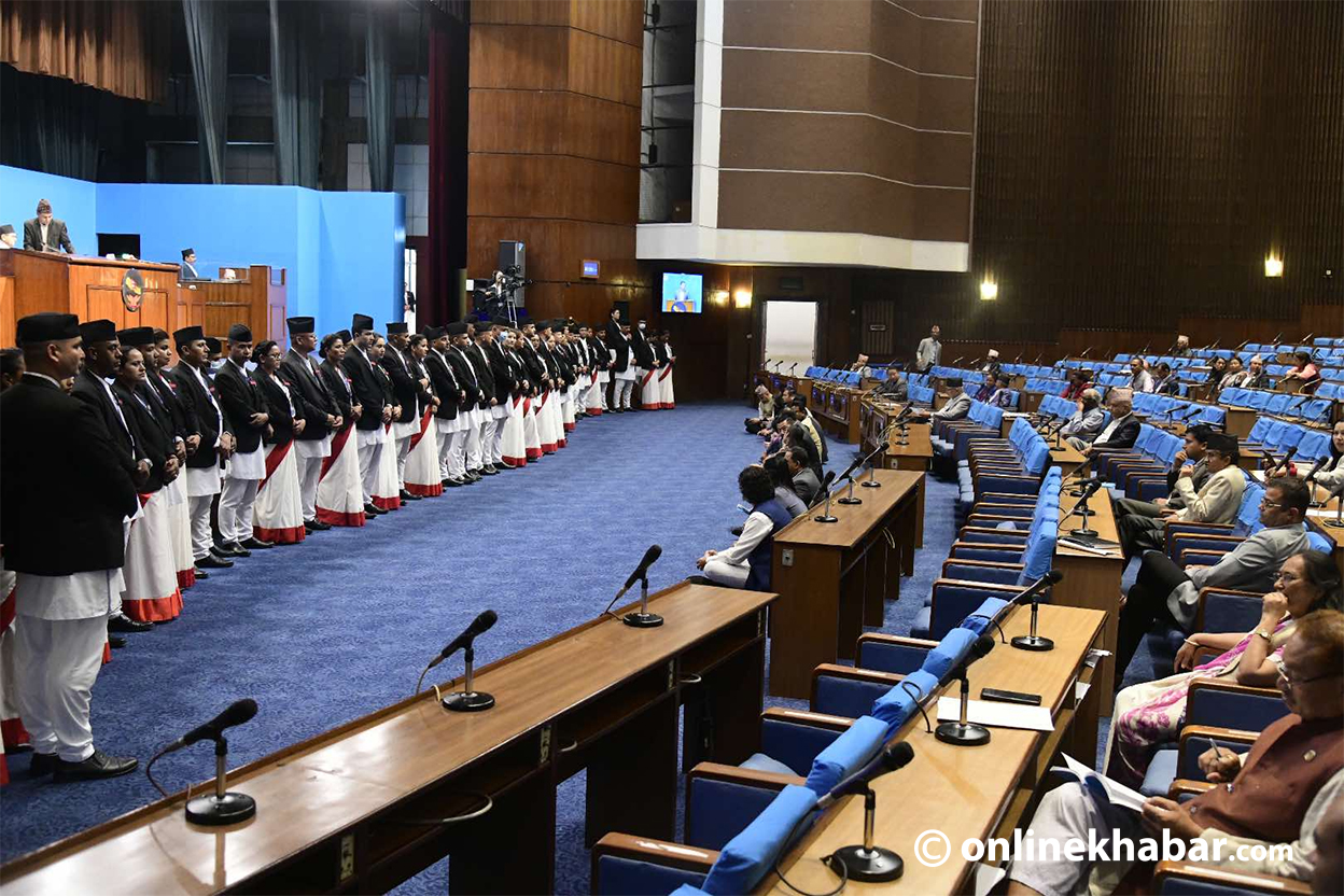 राष्ट्रिय स्वतन्त्र पार्टी (रास्वपा)को नाराबाजीकाबीच चलेको बैठकमा सांसदहरूले बजेटमाथि धारणा राखिरहेका छन् । तर, सांसदहरूका अधिकांश कुर्सी खाली छन् ।