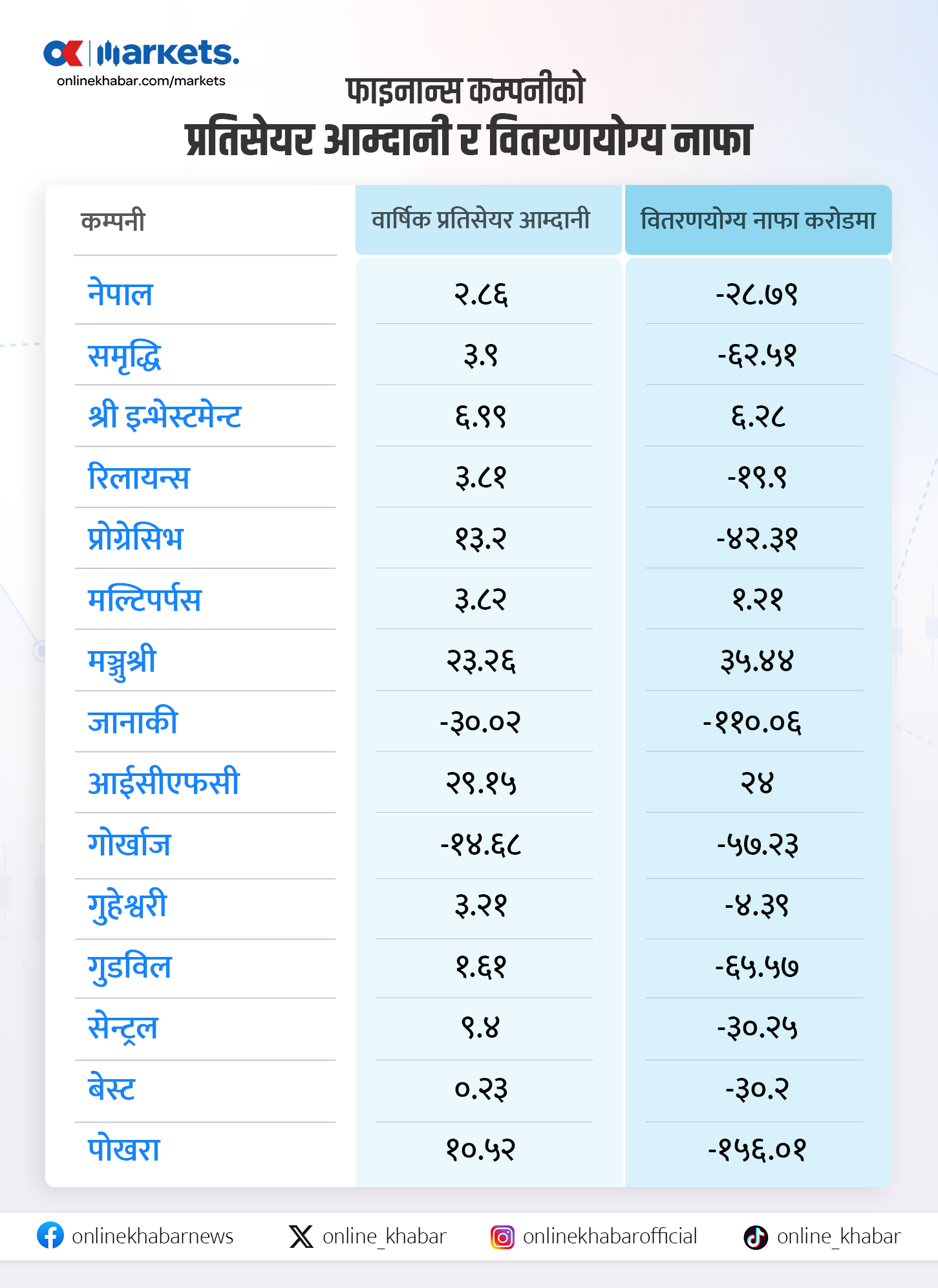 ३ वटा फाइनान्स कम्पनी मात्रै लाभांश दिन सक्ने हैसियतमा देखिएका छन् । मञ्जुश्री, आईसीएफसी र श्री इन्भेस्टमेन्ट फाइनान्स कम्पनी लाभांश दिन सक्ने हैसियतमा छन् । लाभांश दिन नसके पनि मल्टिपर्पस फाइनान्सको वितरणयोग्य नाफा धनात्मक छ ।