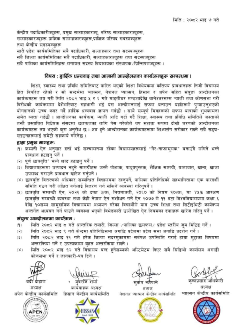 • प्याब्सन, एनप्याब्सन, हिसान र अपेनले भदौ १२ मा विद्यालय बन्द गर्ने आन्दोलन घोषणा गरेका छन्।