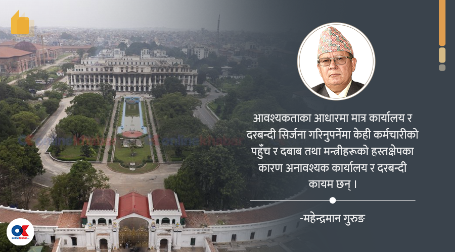ͦ मन्त्रालयको संख्या घटेका कारण संघीय मन्त्रालयहरूमा दुई सचिव रहने व्यवस्था गरिएको थियो । सचिवहरू क्रमश: अवकाशमा जाँदै गर्दा त्यस्तो व्यवस्था हटाउँदै जानुपर्नेमा अहिले पनि कार्यान्वयनकै अवस्थामा छ । त्यसमा सुधार गर्न कुनै कानुनले बाटो छेक्दैन । सरकारको इच्छाशक्तिमा भर पर्छ । त्यसमा सुधार गरी एउटा मन्त्रालयमा एउटा मात्र सचिवको व्यवस्था गर्न सक्दा काममा सहजता र खर्चमा कमी हुन्छ ।