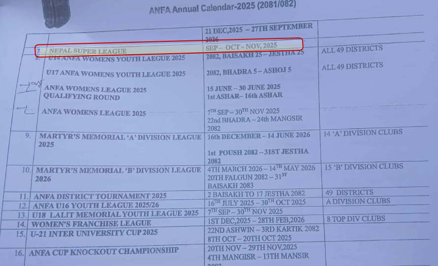यसअघि एन्फाले पारित गरेको क्यालेन्डरमा २०२५ सेप्टेम्बर, अक्टोबर र नोभेम्बरमा नेपाल सुपर लिग (एनएसएल) हुने उल्लेख थियो ।