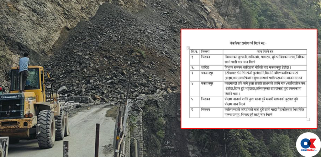 यसैगरी धादिङको नौबिसेबाट मकवानपुरको हेटौंडा निस्कने त्रिभुवन राजपथको बाटोलाई वैकल्पिक सडकको रूपमा प्रयोग गर्न सकिने प्रशासनले जनाएको छ ।