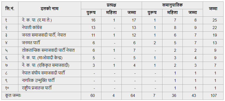 नेकपा एकिकृत समाजवादीका ७ जना छन् । नेपाल संघीय समाजवादी पार्टी, नागरिक उन्मुक्ति पार्टी र राष्ट्रिय प्रजातन्त्र पार्टीका एक/एक जना रहेका छन् ।