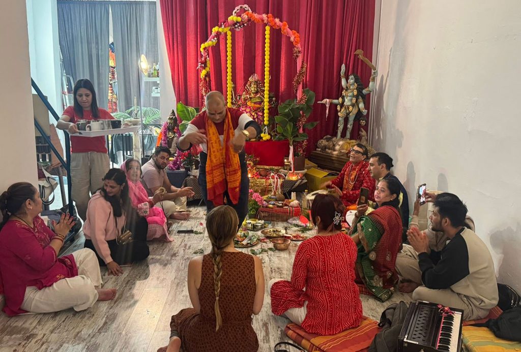 पाँच जना पण्डितहरूको टोलीले चण्डीपाठ, दुर्गा स्तोत्र र वैदिक कर्मकाण्डको स्वरहरू गुञ्जाउँदै बार्सिलोना सहरमा नेपाली दशैंको जीवित माहोल सिर्जना गरेका छन्।