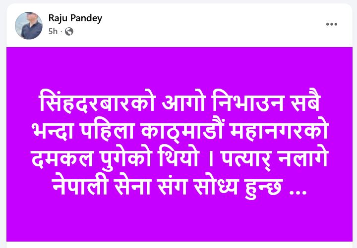 बुधबार दिउँसो नगर प्रहरी प्रमुख पाण्डेले आफ्नो आधिकारिक फेसबुक अकाउन्टमा लेख्दै सिंहदरबारको आगो निभाउन महानगरको दमकल सबभन्दा पहिले पुगेको दाबी गरेका हुन् ।