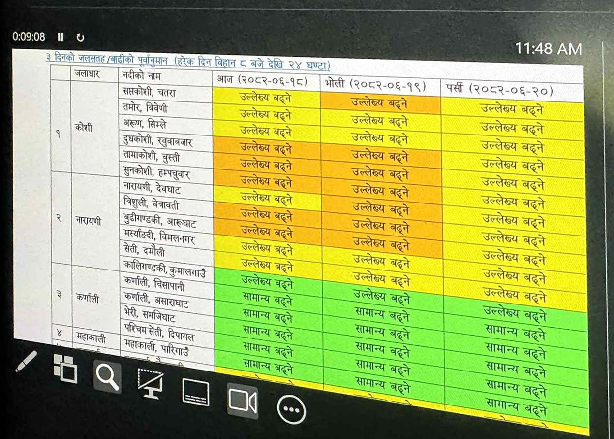 बाढीको सतह अझै बढ्ने सम्भावना भएकाले आज बेलुका र भोलिसम्मका लागि विशेष सतर्कता जरुरी रहेको जल तथा मौसम विज्ञान विभागले जनाएको छ ।