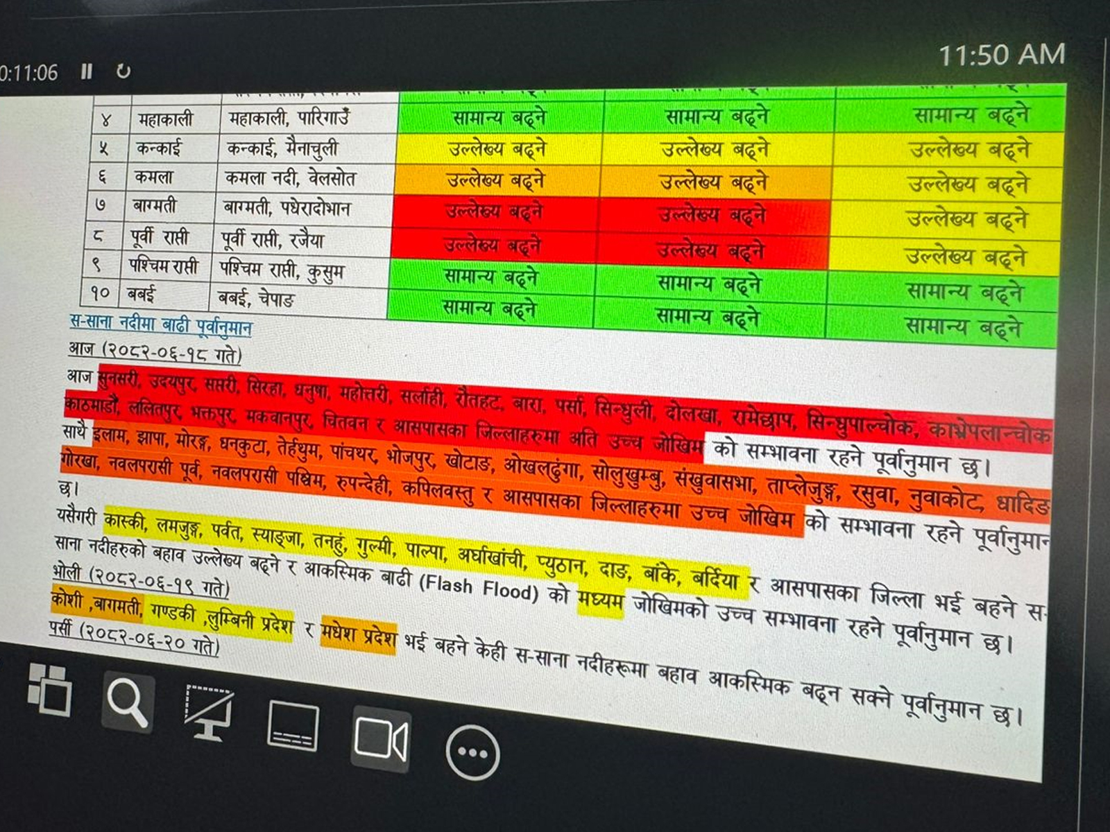 ‘काठमाडौंको हकमा विष्णुमती, बागमती, मनोहरा, नख्खु सबै नदीहरुमा बाढी सतर्कताको तह नजिक पुगेको छ, त्यस हिसाबले यी क्षेत्रमा सतर्कता अपनाउनु पर्नेछ,’ जल तथा मौसम विज्ञान विभागको बाढी पूर्वानुमान शाखा प्रमुख विनोद पराजुलीले भने, ‘आज बेलुका र भोलि विशेष सतर्कता जरुरी छ ।’