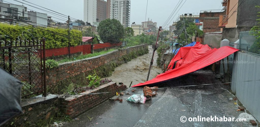 १८ असोज, काठमाडौं। काठमाडौंको सोल्टिमोड कोहिनुर हाउजिङ्ग नजिक रहेको मनमती खोलामा कटान गर्दा घरहरू जोखिममा परेको छ ।