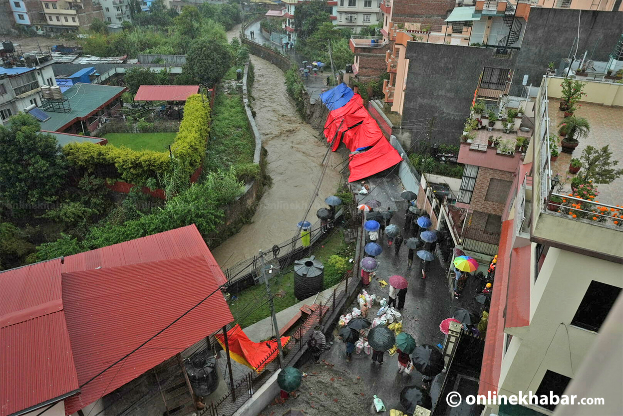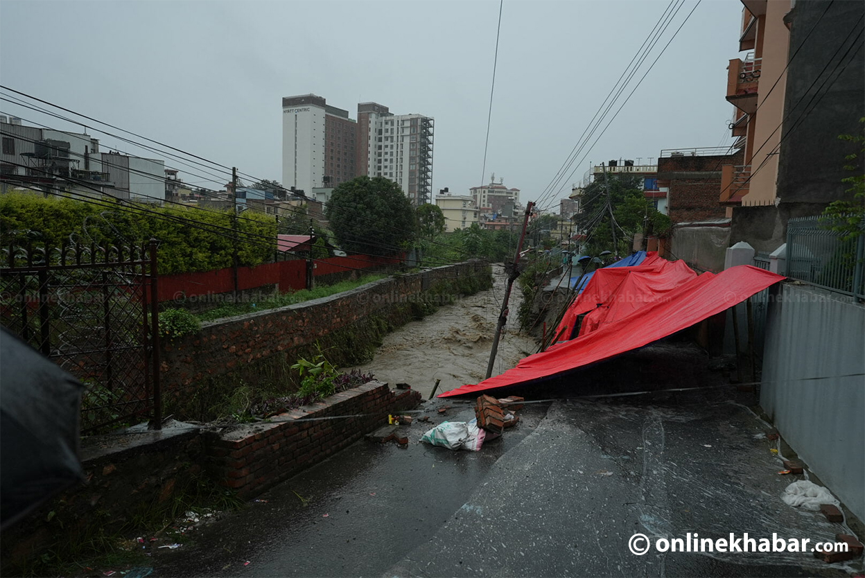 - शुक्रबार विहानदेखि अविरल वर्षाले खोलाको बहाव बढ्दा सडक भत्किएको छ र स्थानीय त्रसित भएका छन्।