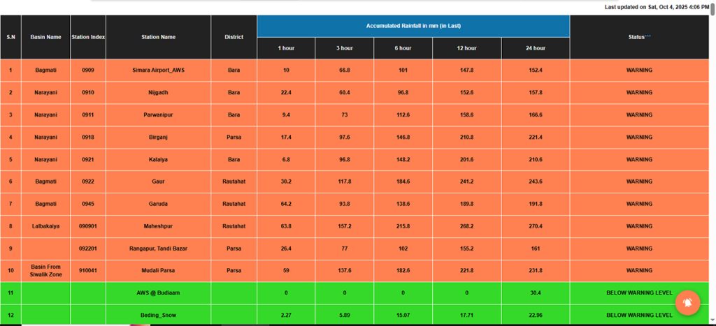 • पछिल्लो २४ घण्टामा रौतहटको महेशपुरमा २७० मिलिमिटर वर्षा भएको छ भने गौरमा २४३.६ मिलिमिटर वर्षा मापन भएको छ।