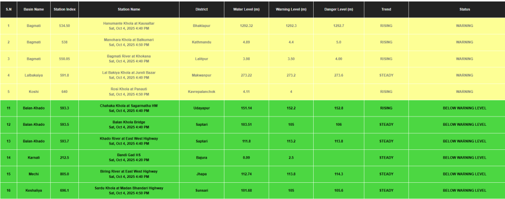 जल तथा मौसम विज्ञान बाढी पूर्वानुमान महाशाखाले काभ्रे-रोसी, मनोहरा- काठमाडौं, बागमती- काठमाडौं, लालबकैया- मकवानपुरमा जलसतह सतर्कता तह माथि र बढ्दो रहेको उल्लेख गरेको छ ।