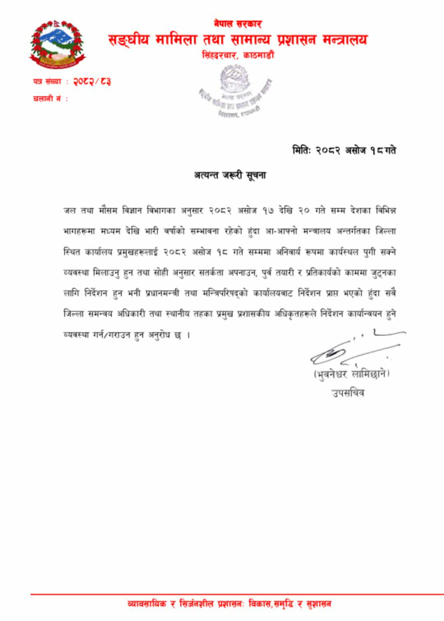 कार्यस्थल पुगेर पूर्व तयारी र प्रतिकार्यको काममा जुट्नका लागि निर्देश गरिएको छ ।संघीय मन्त्रालयका उपसचिव भुवनेश्वर लामिछानेले निकालेको सूचनामा भनिएको छ, ‘सबै जिल्ला समन्वय अधिकारी तथा स्थानीय तहका प्रमुख प्रशासकीय अधिकृतहरूले निर्देशन कार्यान्वयन हुने व्यवस्था गर्न÷गराउन हुन अनुरोध छ ।’