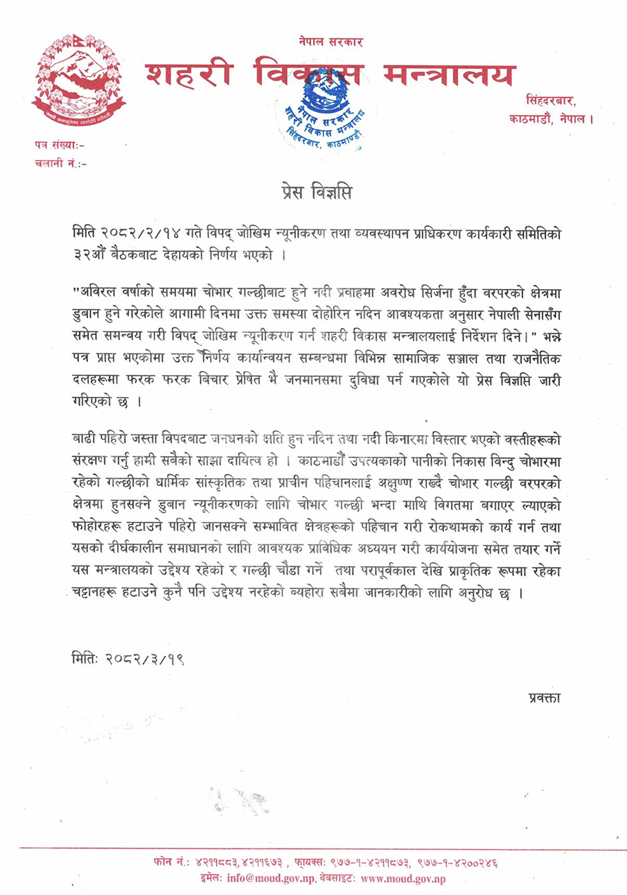 १४ असोजमा बसेको विपद् जोखिम न्यूनीकरण तथा व्यवस्थापन प्राधिकरण कार्यकारी समितिको ३२औं बैठकले ‘अविरल वर्षाको समयमा चोभार गल्छीबाट हुने नदी प्रवाहमा अवरोध सिर्जना हुँदा वरपरको क्षेत्रमा डुबान हुने गरेकाले आगामी दिनमा उक्त समस्या दोहोरिन नदिन आवश्यकता अनुसार नेपाली सेनासँग समेत समन्वय गरी विपद् जोखिम न्यूनीकरण गर्न सहरी विकास मन्त्रालयलाई निर्देशन दिने’ भन्ने पत्र प्राप्त भएको सहरी विकास मन्त्रालयले जनाएको छ ।